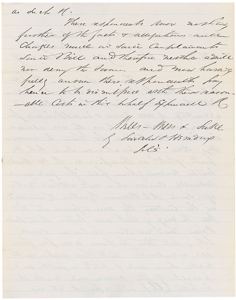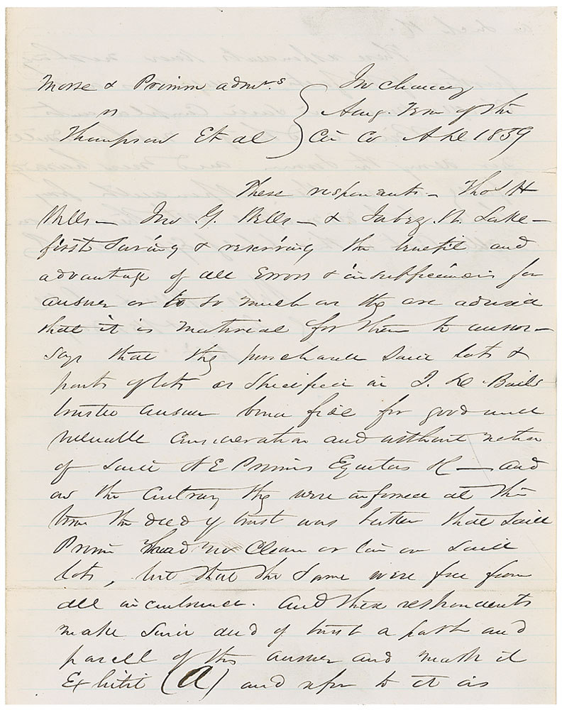 American lawyer (1818–1891) best known as Lincoln’s law partner from 1841. He later wrote a biography of Lincoln, Herndon’s Lincoln: The True Story of a Great Life, which provided an important up-close account of Lincoln’s career in law and politics. ADS, signed by Herndon “Lincoln and Herndon, Sol[icitor]s.,” one lightly lined page both sides, 7.75 x 9.75, April 1859. A document filed in the case of Morse & Primm vs. Thompson et al, which involved a dispute over a land transaction. A couple short edge separations at folds, otherwise fine condition. RR Auction COA.