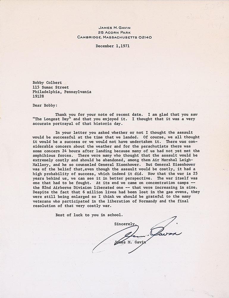 Notable American World War II general (1907–1990) who commanded the 82nd Airborne Division during the pivotal Battle of Normandy. TLS, one page, 8.5 x 11, personal letterhead, December 1, 1971. Gavin writes to an admirer. In part: “I am glad that you saw ‘The Longest Day’ and that you enjoyed it. I thought it was a very accurate portrayal of that historic day. In your letter you asked whether or not I thought the assault would be successful at the time that we landed. Of course, we all thought it would be a success or we would not have undertaken it. There was considerable concern about the weather and for the parachutists there was some concern 24 hours after landing because many of us had not yet met the amphibious forces….General Eisenhower was of the belief that, even though the assault would be costly, it had a high probability of success, which indeed it did… The war itself was one that had to be fought. At its end we came on concentration camps—the 82nd Airborne Division liberated one—that were increasing in size….I think we should be grateful to the many veterans who participated in the liberation of Normandy and the final resolution of that very costly war.” In very fine condition. RR Auction COA.