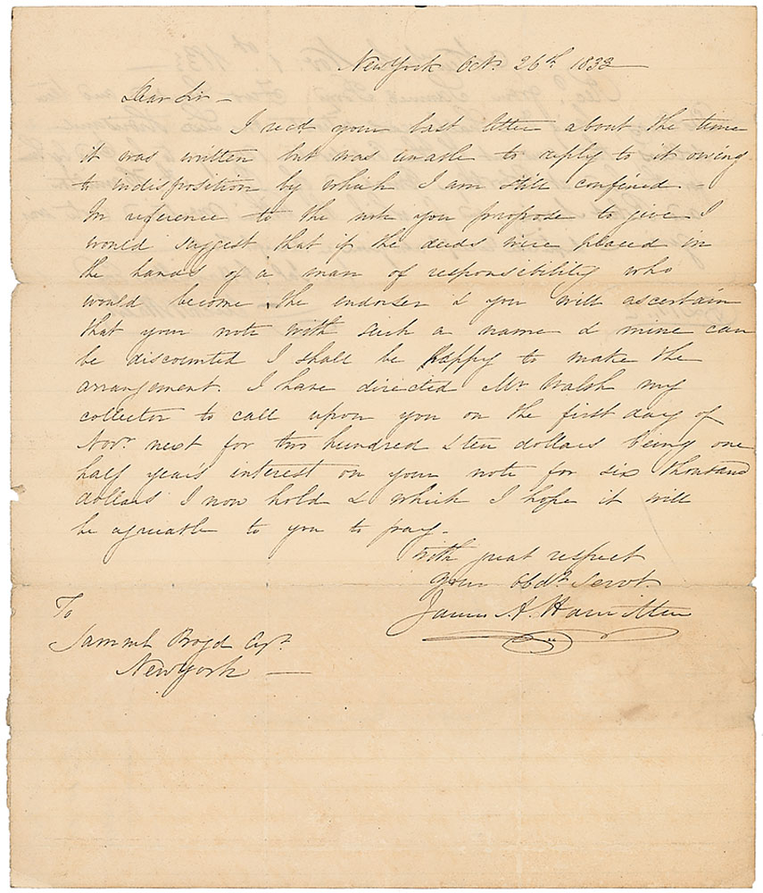 Son (1788–1878) of Alexander Hamilton, officer in the War of 1812, acting secretary of state to Andrew Jackson, and US attorney for the Southern District of New York. ALS signed “James A. Hamilton,” one page, 8 x 9.5, October 26, 1833. Hamilton writes regarding a financial matter. In part: “I have directed Mr. Walsh my collector to call upon you on the first day of Nov. next for two hundred & ten dollars being one half year’s interest on your note for six thousand dollars I now hold.” In very good condition with intersecting folds, edge chipping, paperclip impression to top edge, and some light soiling over signature. RR Auction COA.