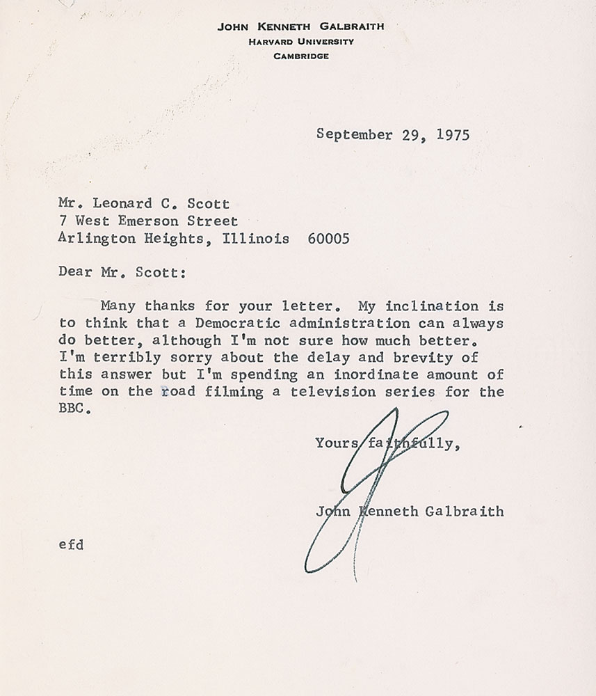 TLS signed “JG,” one page, 5.75 x 6.75, personal Harvard University letterhead, September 29, 1975. Letter to an admirer. In part: “My inclination is to think that a Democratic administration can always do better, although I’m not sure how much better.” In fine condition. RR Auction COA.