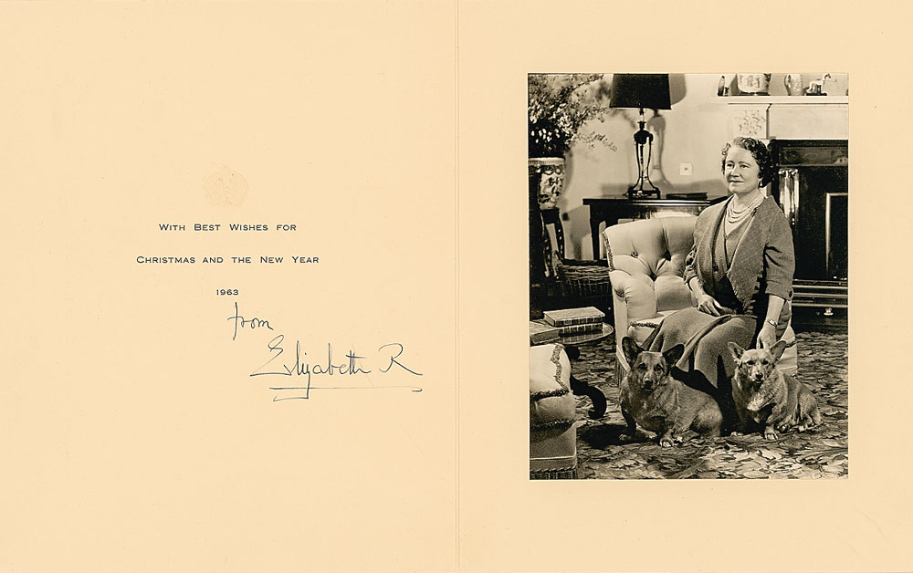 Christmas card from 1963, measuring 8 x 10 closed and bearing a gold-embossed crown on the front, signed inside in fountain pen, “From, Elizabeth R.” Inside bears a 5.5 x 7 portrait of Elizabeth posing with her two corgi dogs and a pre-printed Christmas sentiment. In fine condition. Accompanied by its transmittal envelope. Pre-certified PSA/DNA and RR Auction COA.