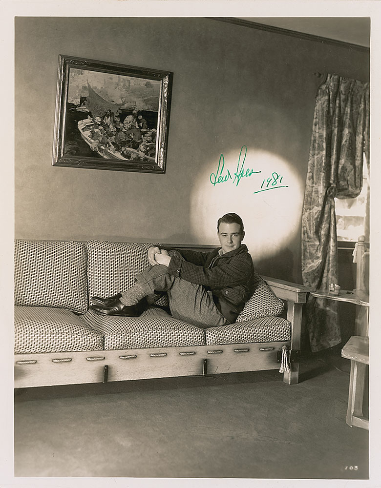 Glossy 8 x 10 photo of Ayres sitting on his couch, signed in green ink, “Lew Ayres, 1981.” Reverse bears an Otto Dyar photographer’s stamp. In fine condition. Pre-certified PSA/DNA and RR Auction COA.