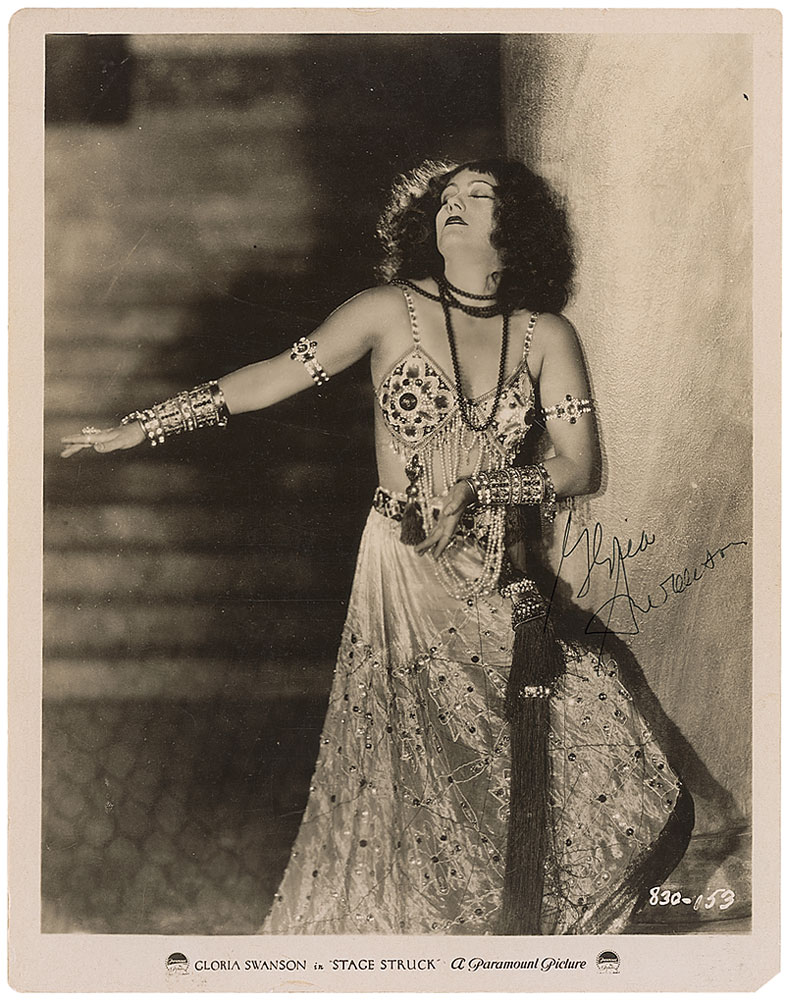 Vintage glossy 8 x 10 Paramount Pictures publicity photo of Swanson in Stage Struck, signed in black ink. Some scattered creasing and clipped lower right corner tip, otherwise fine condition. Pre-certified PSA/DNA and RR Auction COA.
