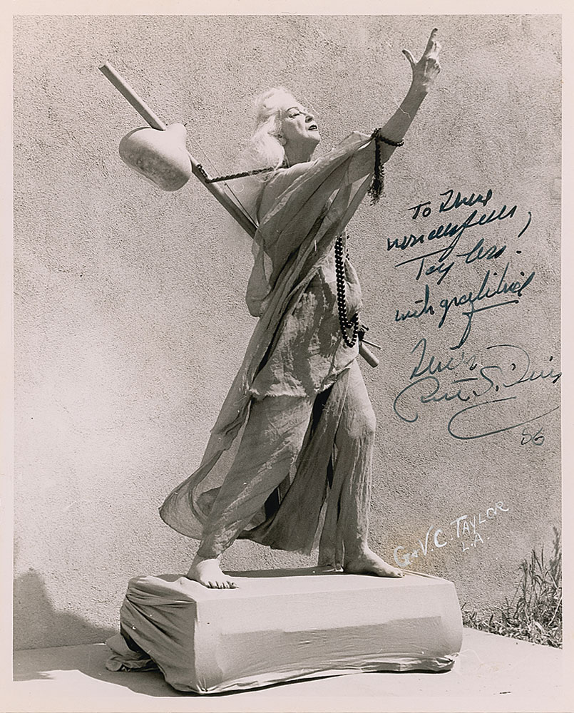Modern dance pioneer (1879–1968). Vintage glossy 8 x 10 full-length photo of an older St. Denis striking a pose, signed and inscribed in fountain pen. In fine condition. Pre-certified PSA/DNA and RR Auction COA.
