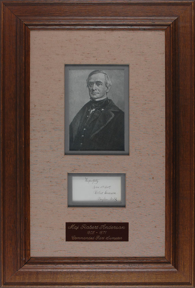 Union general (1805–1871) who commanded three United States forts: Castle Pinckney, Fort Moultrie, and Fort Sumter. In the face of South Carolina’s imminent secession, Anderson refused a formal demand for his surrender and in the early morning hours of April 12, 1861, Fort Sumter was bombarded, and the Civil War began. Crisp and precise war-dated ink signature, “Respectfully, Your obt. Servt., Robert Anderson, Brig. Gen. U.S.A.,” on an off-white sheet. Double-cloth-matted and framed (without glass) with a portrait of Anderson to an overall size of 15.75 x 23.25. In fine condition. Pre-certified PSA/DNA and RR Auction COA.