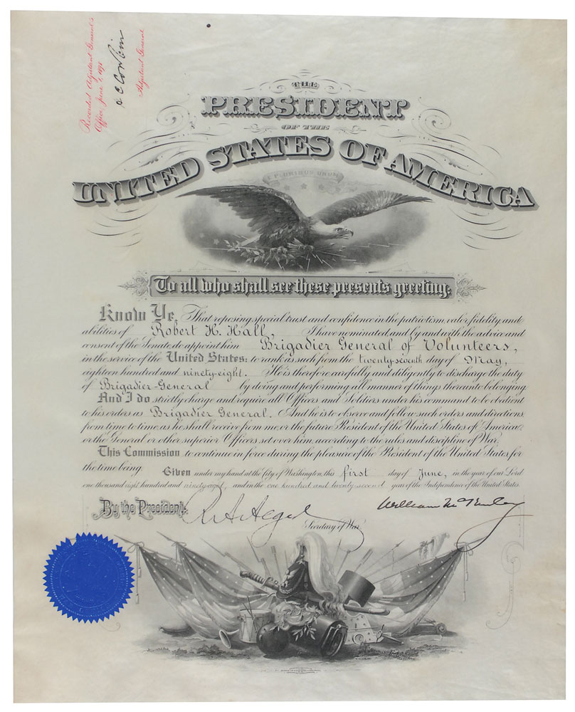 Choice partly-printed vellum DS as president, one page, 15 x 18.5, June 1, 1898. President McKinley appoints Robert H. Hall as “Brigadier General of Volunteers in the service of the United States.” Signed at the conclusion by McKinley and countersigned by Russell A. Alger as secretary of war. The beautiful embossed blue war office seal affixed to the lower left remains fully intact. In fine condition. An incredibly clean, gorgeous document bearing an uncommonly bold full presidential signature. Pre-certified John Reznikoff/PSA/DNA and RR Auction COA.