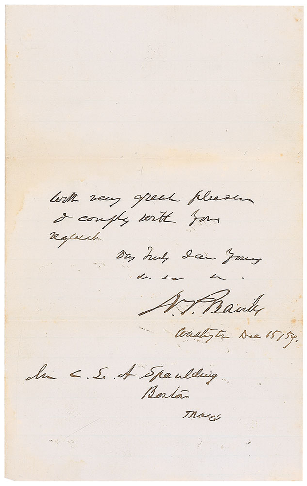ANS signed “N. P. Banks,” one page, 5 x 8, Washington, December 15, 1857. Response to an autograph request. In full: “With very great pleasure I comply with your request.” In fine condition. RR Auction COA.