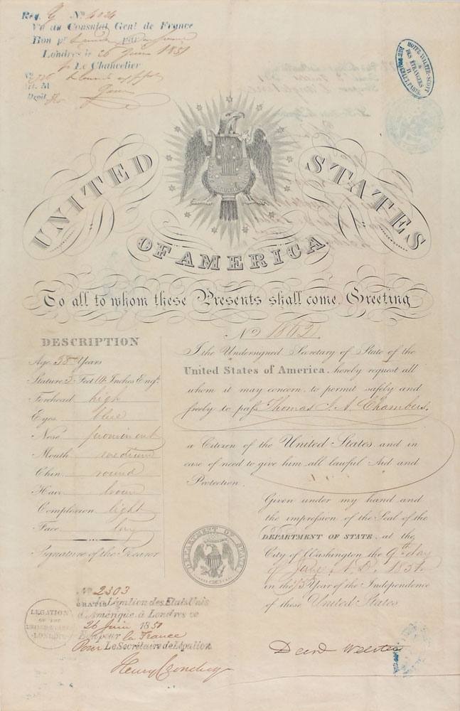 Partly-printed DS, signed “Dan’l Webster,” one page, 10.5 x 16, June 9, 1851. Passport document issued to Thomas J. A. Chambers allowing him “safely and freely to pass,” filled out with his physical description. Crisply signed at the conclusion by Webster as secretary of state. Passport bears a few French visa stamps on both sides. Intersecting storage folds (two vertical folds passing through single letters of the signature), and a few slight pinholes and separations at intersections, otherwise fine condition. Pre-certified PSA/DNA and RR Auction COA.