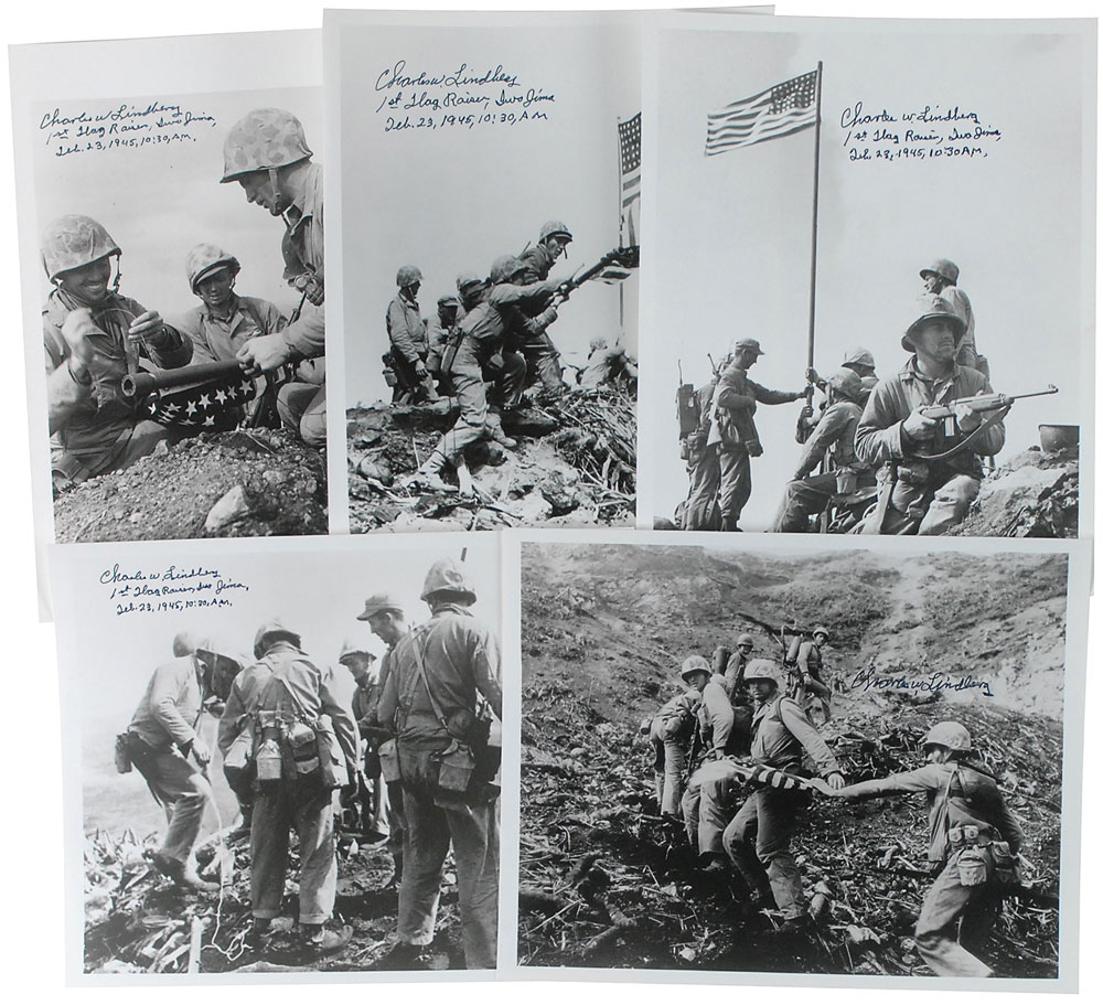 Five satin-finish photos from the first Iwo Jima flag-raising, each signed in black felt tip, with Lindberg adding, “1st Flag Raiser, Iwo Jima, Feb. 23, 1945, 10:30 A.M.,” to four of the photos. In very fine condition. RR Auction COA.