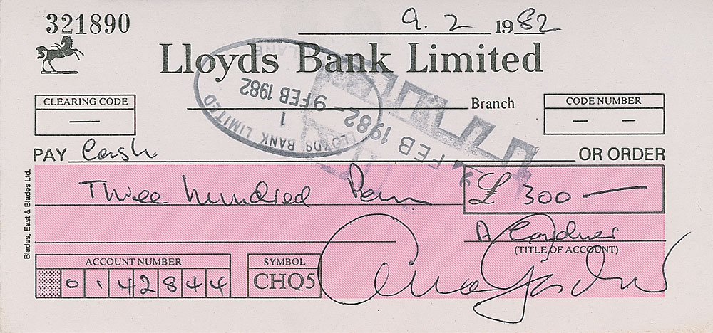 Bank check, 6.25 x 3, filled out and signed by Gardner, payable to Cash for £300.0.0, September 2, 1982. In fine condition, with bank stamps to body, neither affecting the clean signature area. Pre-certified PSA/DNA and RR Auction COA.