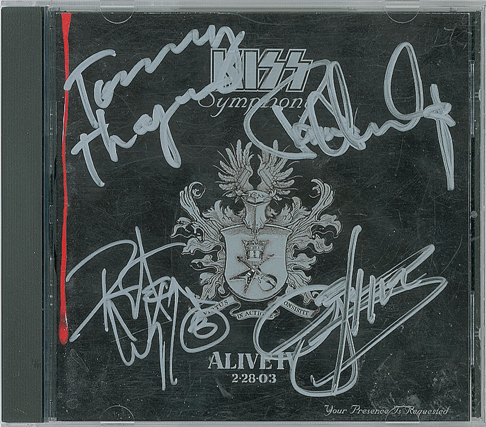 Symphony: Alive IV CD booklet signed on the front cover in silver ink by Gene Simmons, Paul Stanley, Tommy Thayer, and Peter Criss. In fine condition. The CD is not included. Pre-certified Roger Epperson/REAL and RR Auction COA.