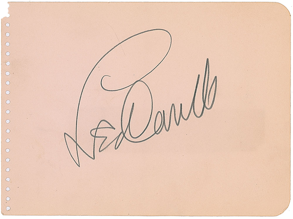 Original vintage signed fountain pen self-portrait from his role as Pancho on an off-white 4.25 x 5.75 album page bearing two affixed magazine photos. Also includes a vintage pencil signature, “Leo Carillo,” on an off-white 5.75 x 4.25 album page. In overall fine condition. Pre-certified PSA/DNA and RR Auction COA.