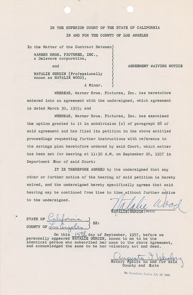 DS signed “Natalie Wood,” one page, 8.5 x 13, September 19, 1957. Los Angeles Superior Court document regarding a contract between Warner Bros. and “Natalie Gurdin (Professionally known as Natalie Wood)” setting the date for a hearing “with reference to the savings plan heretofore ordered by said Court.” Signed at the conclusion by Wood and a notary. In fine condition, with expected document wear. Pre-certified PSA/DNA and RR Auction COA.