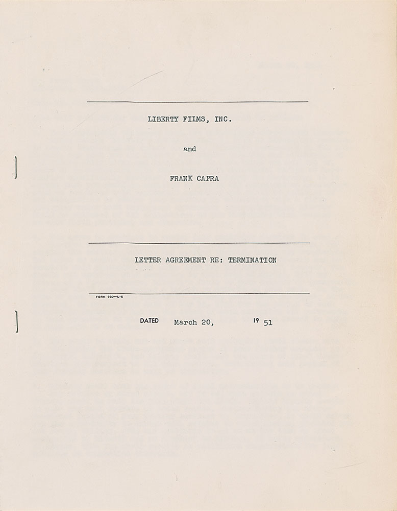 DS, two pages, 8.5 x 11, March 20, 1951. Document terminating Capra’s contract with Liberty Films, in which he agrees to “continue to render…exclusive services in connection with the photoplay now entitled Here Comes the Groom.” Signed at the conclusion by Capra and two Liberty Films representatives. Stapled into a 9 x 11.5 paper folder. In fine condition, with expected document wear. Pre-certified PSA/DNA and RR Auction COA.