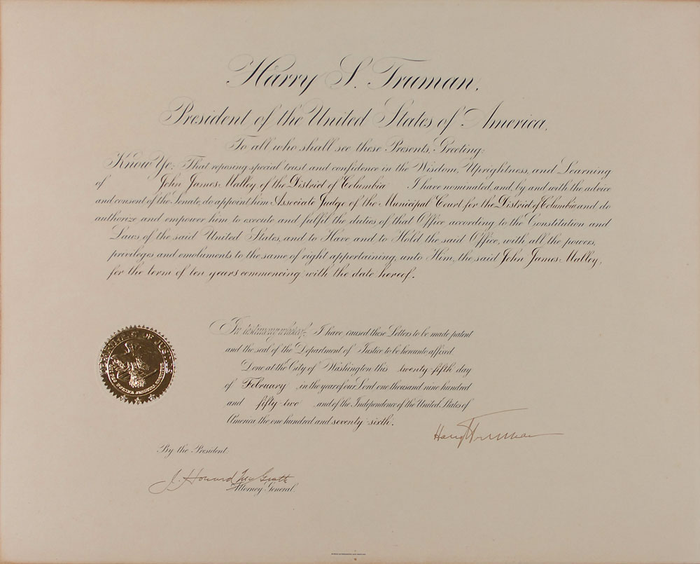 Partly-printed DS as president, one page, 20 x 16, February 25, 1952. Truman appoints John James Malloy an “Associate Judge of the Municipal Court for the District of Columbia.” Signed at the conclusion by Truman and countersigned by Attorney General J. Howard McGrath. Document is affixed to an identical size board. In fine condition. Document retains its bright gold foil seal. Pre-certified John Reznikoff/PSA/DNA and RR Auction COA.