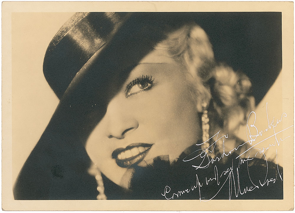 Vintage matte-finish 7 x 5 photo, signed and inscribed in white ink “For Gordon Backus, Come up and see me some time, Mae West.” In fine condition. Pre-certified PSA/DNA and RR Auction COA.