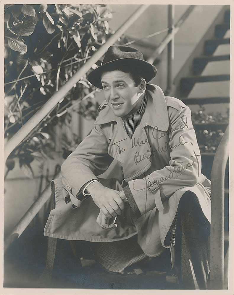 Vintage matte-finish 8 x 10 photo of Stewart, dressed in a trench coat and Fedora, sitting outdoors on a staircase, signed and inscribed in fountain pen “To May Cosand, best wishes, James Stewart.” In fine condition. Pre-certified PSA/DNA and RR Auction COA.