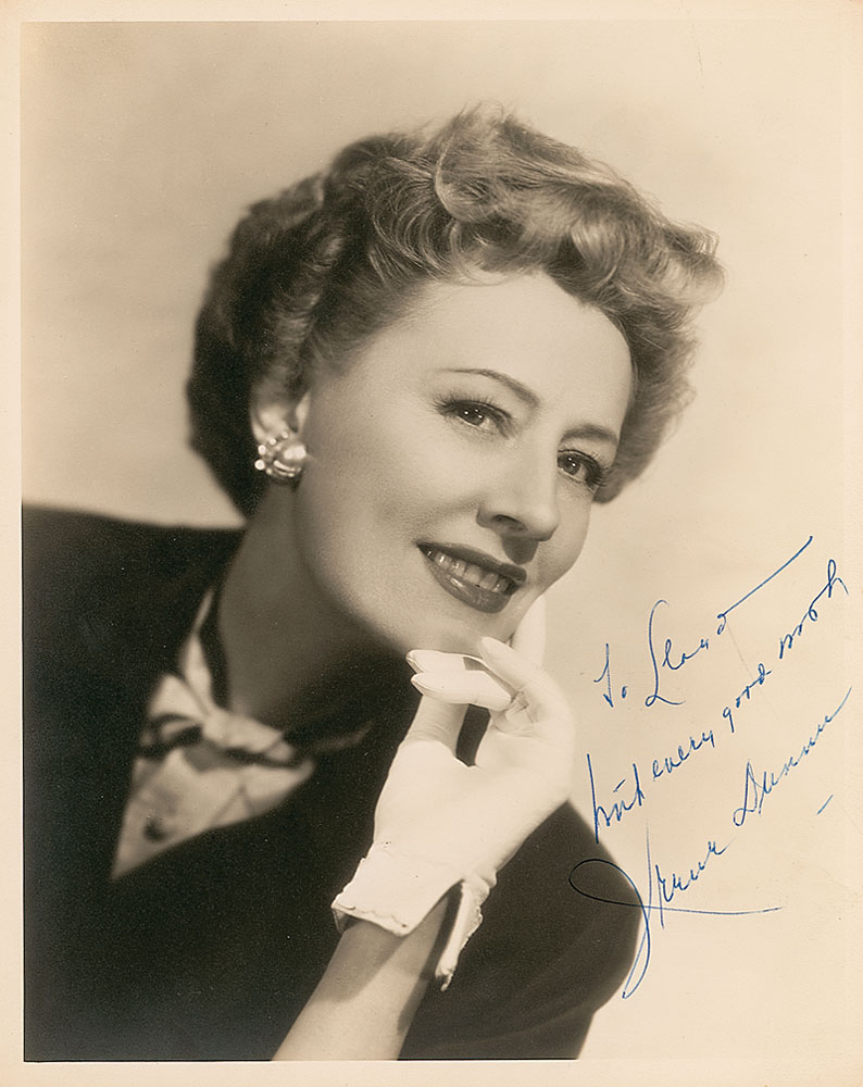Matte-finish 8 x 10 photo, signed and inscribed in blue ballpoint “To Leland—with every good wish, Irene Dunne.” In fine condition. Pre-certified PSA/DNA and RR Auction COA.