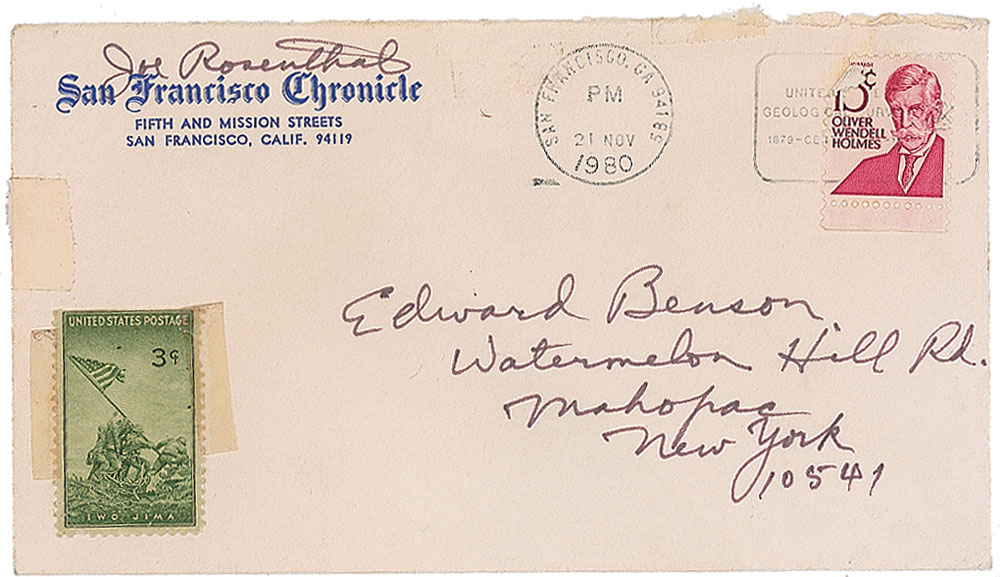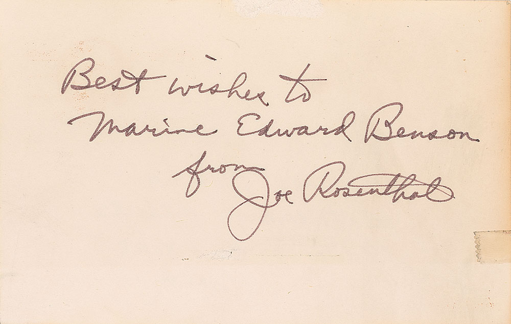 Felt tip signature and inscription, “Best wishes to Marine Edward Benson, from Joe Rosenthal,” on an off-white 5.5 x 3.5 card. In fine condition, with a small piece of tape affixed to the lower right. Accompanied by the original mailing envelope, filled out in Rosenthal’s hand, including his signature in the return address area. RR Auction COA.