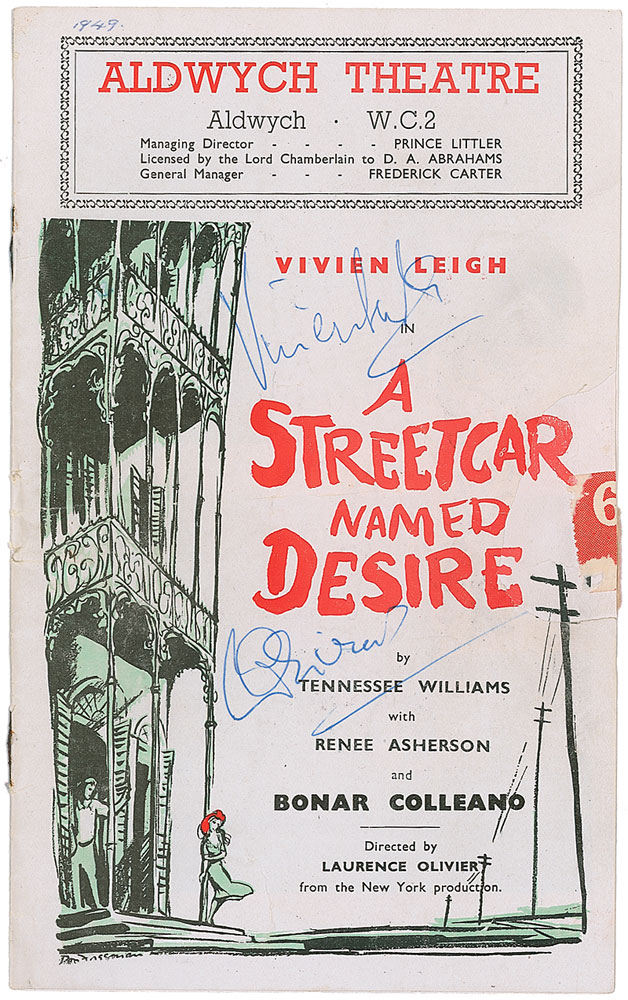 Program from the Aldwych Theatre’s 1949 presentation of A Streetcar Named Desire, 5 x 8, signed on the front cover in blue ballpoint by Vivien Leigh and Laurence Olivier. In very good condition, with a central horizontal fold, repair to paper loss on front cover, and scattered creasing and handling wear. Pre-certified PSA/DNA and RR Auction COA.