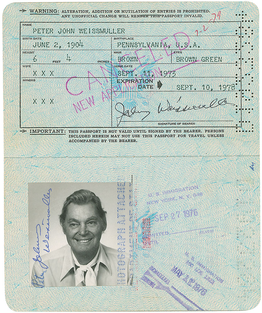 Weissmuller’s personal passport, number D1923284, issued on September 11, 1973. Passport measures 3.75 x 6, and contains his typed personal information on the second page, signed at the bottom, “Johnny Weissmuller.” Affixed opposite the personal information page is Weissmuller’s 2.5 x 2.5 passport snapshot, signed vertically in the left border, “Peter Johnny Weissmuller.” Balance of the pages bear visa stamps from around the world, dated between 1975 and 1976, including those from Portugal, Turkey, Argentina, and the United Kingdom. In fine condition. Originates from the estate of Weissmuller’s stepdaughter, Lisa Weissmuller Gallagher. Accompanied by two personal checks payable to the passport office made out by his wife, Maria Weissmuller. A one-of-a-kind collectible from the life of the talented actor and sportsman. Pre-certified PSA/DNA and RR Auction COA.