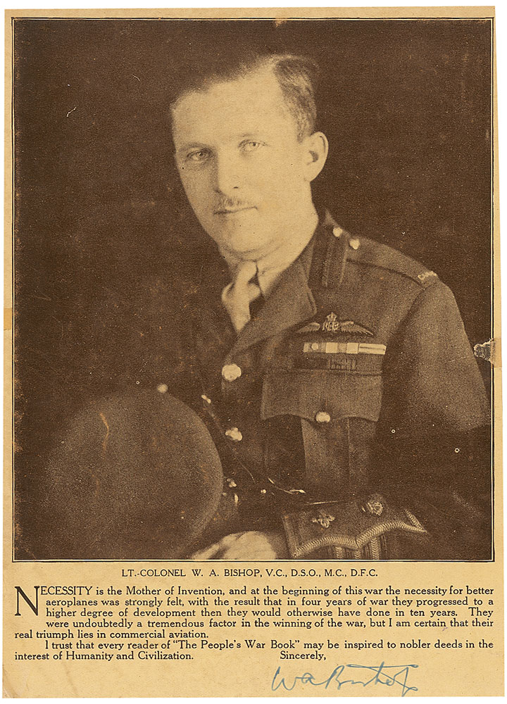 Highly decorated Canadian ace (1894–1956) officially credited with 72 victories in World War I. Vintage 6.5 x 9 book photo, signed in fountain pen, “W. A. Bishop.” In fine condition, with a bit of scattered light soiling and surface wear. This page was originally part of The People's War Book (1920). RR Auction COA.