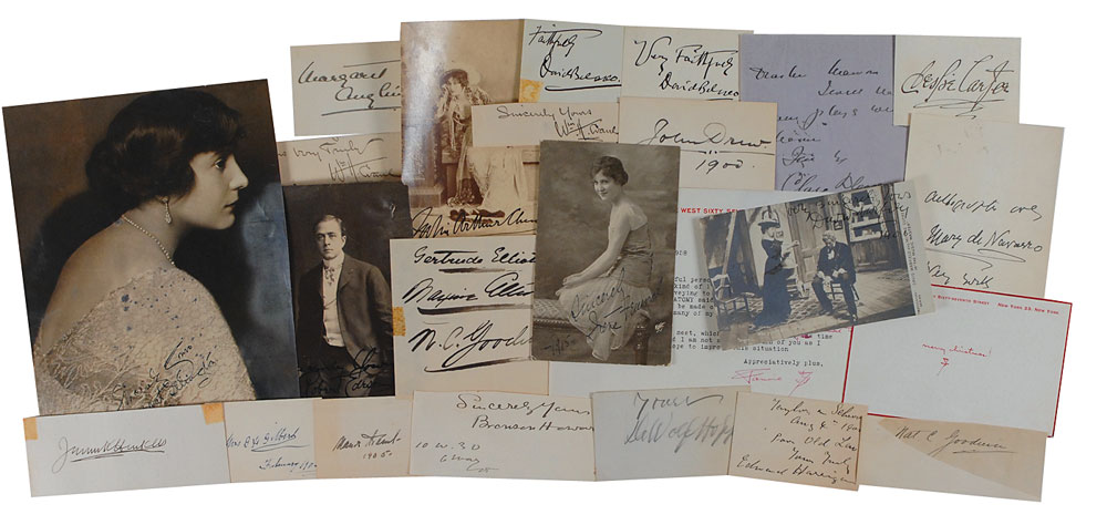 Collection of 47 items, consisting primarily of signatures, with a few signed photos and a couple of letters, each signed by an actor or actress of the theatre. Signers include: Billie Burke, David Belasco, Leslie Carter, William H. Crane, John Drew, Maxine Elliott, Maude Adams, Fannie Hurst, Bronson Howard, DeWolf Hopper, Nat Goodwin, Mary Garden, Richard Mansfield, Harry Lauder, and Anton Lang. In overall fine condition.