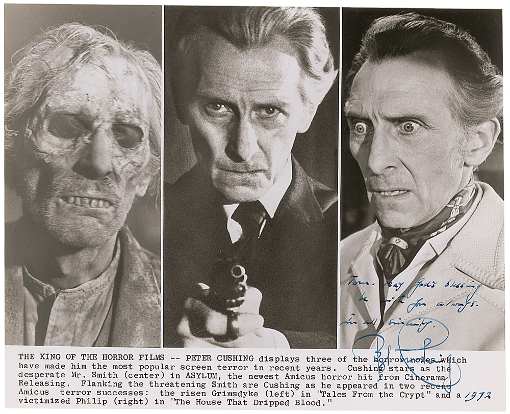 Terrific glossy 9.75 x 8 publicity photo of Cushing as he appeared in three different horror roles, signed and inscribed in fountain pen, “Tom—May God’s blessing be with you always. In all sincerity, Peter Cushing, 1972.” In fine condition, with possibly trimmed edges. Pre-certified PSA/DNA and RR Auction COA.