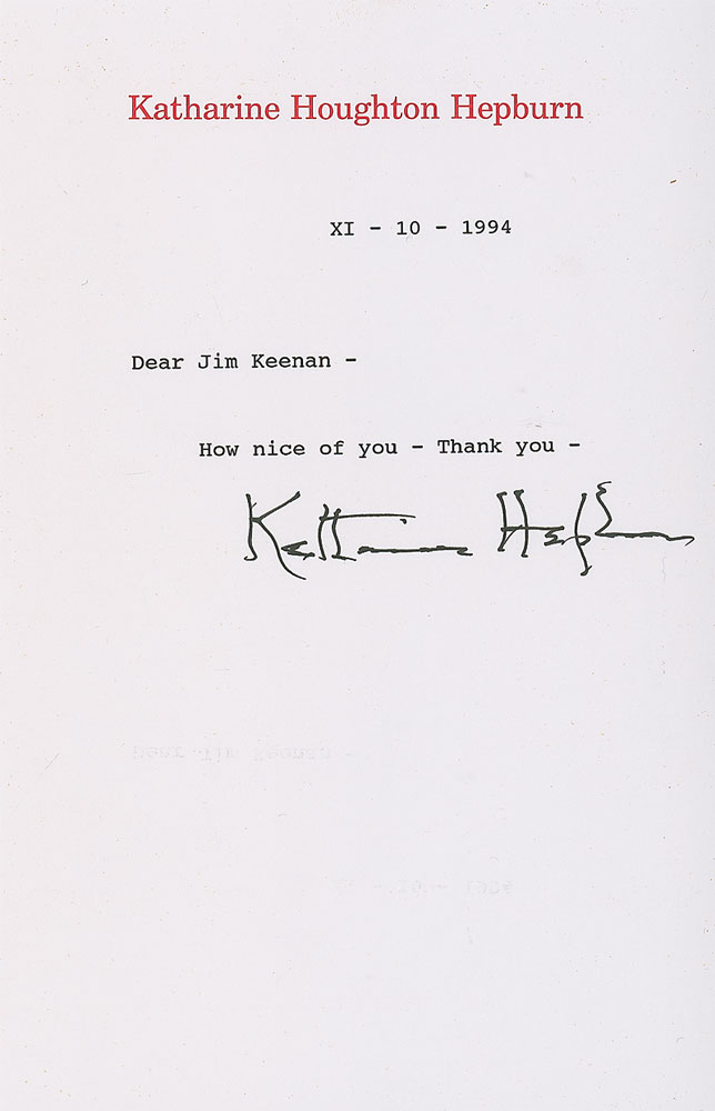 TLS, one page, 5.5 x 8.5, personal letterhead, November 10, 1994. Letter to an admirer. In full: “How nice of you—Thank you.” In fine condition. Accompanied by an unsigned glossy 8 x 10 portrait. Pre-certified PSA/DNA and RR Auction COA.
