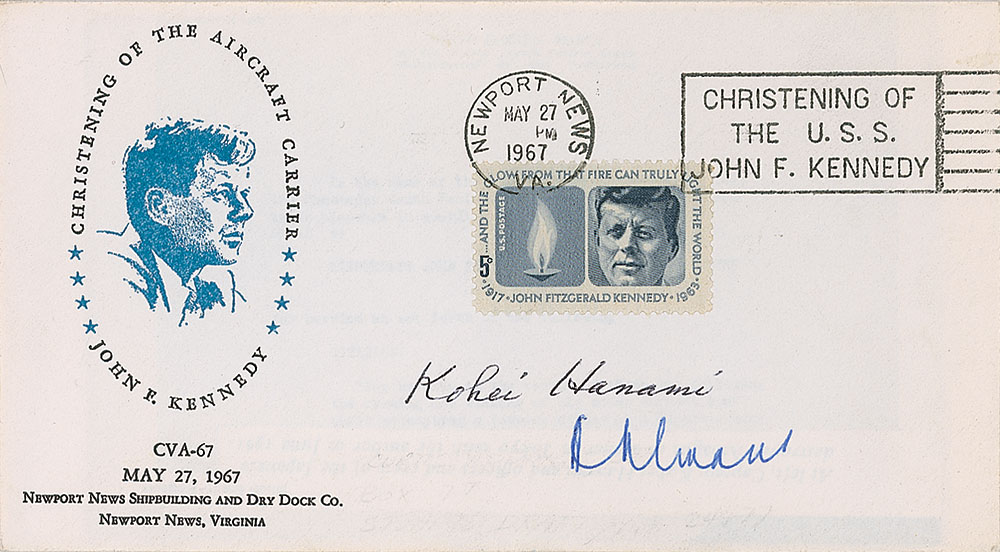 Commemorative FDC with a cachet honoring the christening of the USS John F. Kennedy aircraft carrier, signed on the front in black felt tip by Kohei Hanami, commander of the Japanese destroyer Amagiri that collided with PT–109, which at the time was carrying Ensign John F. Kennedy. In addition, the Australian coastwatcher, Arthur Evans, that rescued Kennedy and his crew, has also signed the FDC in blue ballpoint. In very fine condition. RR Auction COA.