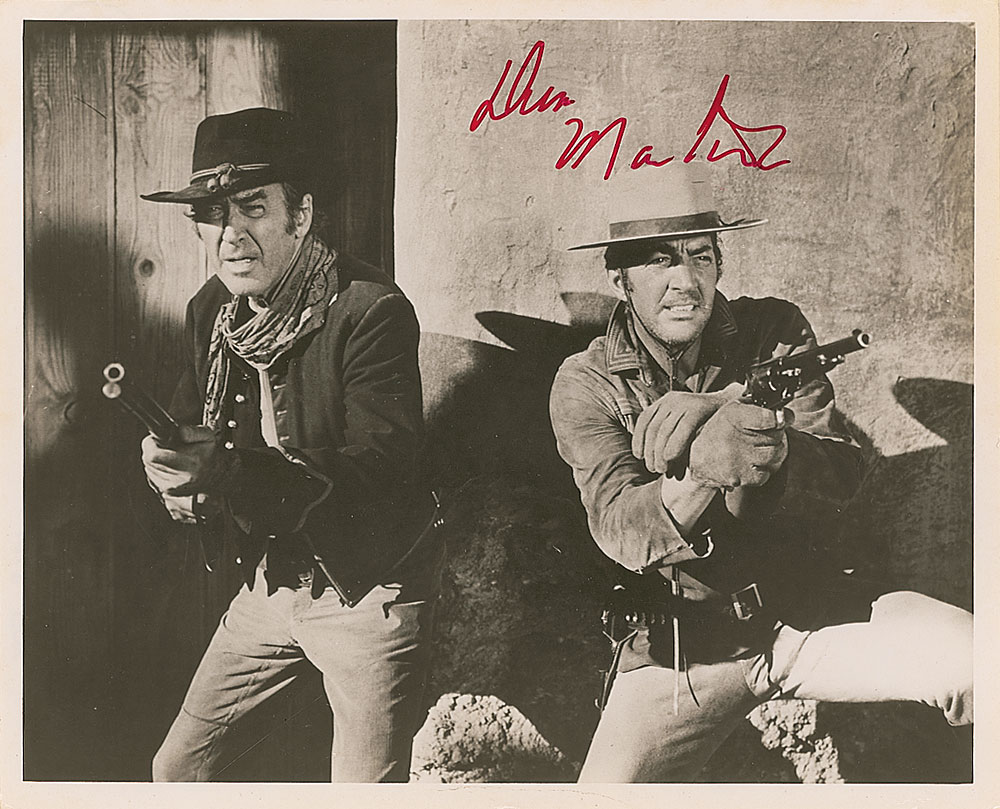Exciting glossy 10 x 8 photo of Martin alongside James Stewart in the 1968 film Bandolero, signed in red felt tip. In fine condition, with scattered surface creases. Pre-certified PSA/DNA and RR Auction COA.