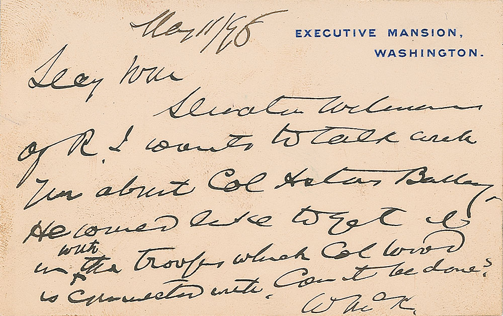 ANS as president signed “W. McK.,” on a 4.5 x 2.75 Executive Mansion card, March 11, 1898. Note to Secretary of War Russell Alger regarding the Spanish-American War. In full: “Secy War, Senator Wetmore of R.I. wants to talk with you about Col Aster Bailey. He would like to get in with the troops which Col. Wood is connected with. Can it be done?” In fine condition, with some mild toning. Accompanied by an unsigned engraving. Pre-certified John Reznikoff/PSA/DNA and RR Auction COA.