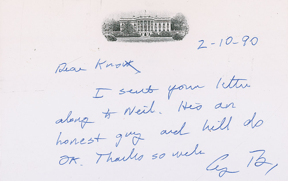 Uncommon ALS as president, one page, 6.5 x 4, engraved White House vignette letterhead, February 10, 1990. Letter to Knox reads, in full: “I sent your letter along to Neil. He’s an honest guy and will do OK. Thanks so much.” In very fine condition. Pre-certified PSA/DNA and RR Auction COA.