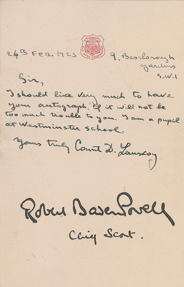 Vintage ink signature, “Robert Baden-Powell, Chief Scout,” at the bottom of a letter requesting his autograph on an off-white 3.75 x 6 sheet, dated February 24, 1923. In fine condition. RR Auction COA.