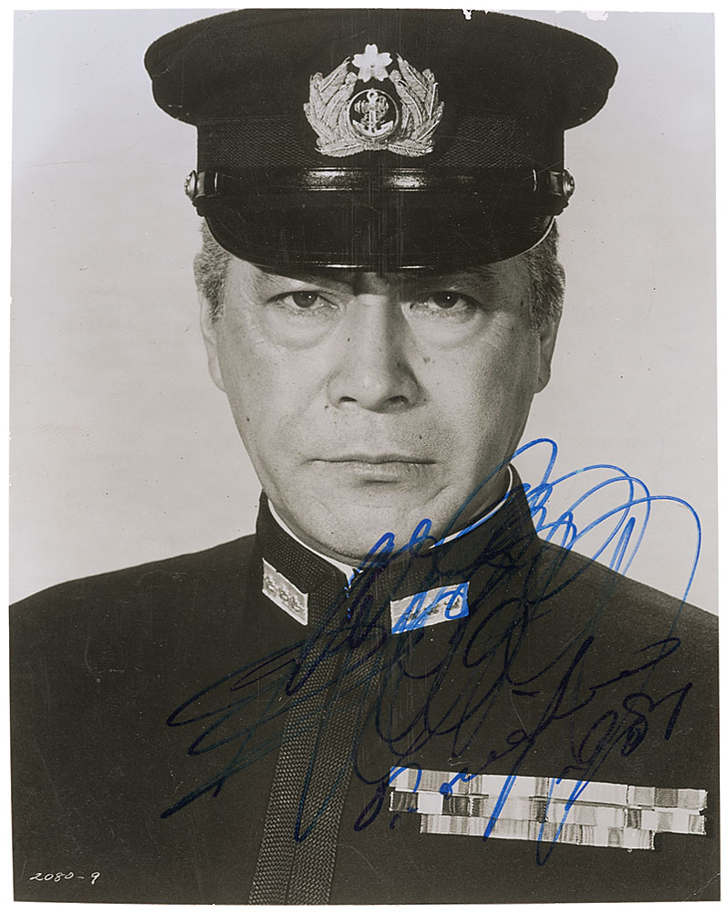Glossy 7.25 x 9 head-and-shoulders photo of Mifune in military uniform, signed in blue felt tip, and signed again in print, “T. Mifune 1987.” In very good condition, with trimmed edges, scattered creases, and slight surface loss along top edge. Pre-certified PSA/DNA and RR Auction COA.