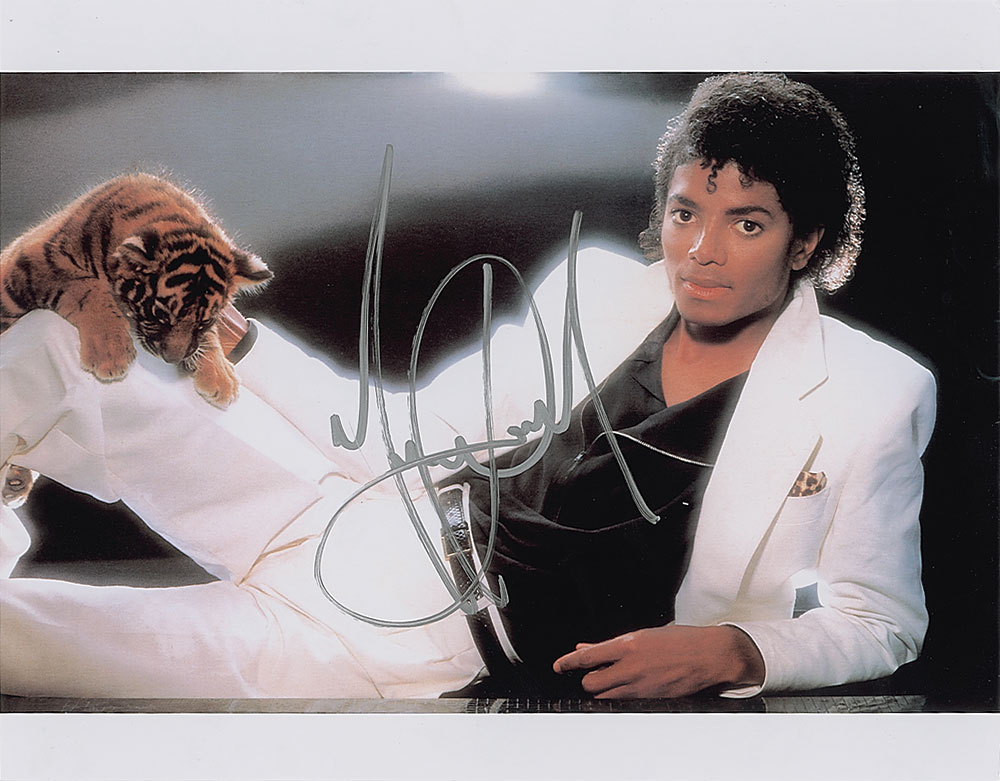 Color glossy 14 x 11 photo of Jackson in a white suit with a tiger cub on his knee, signed in silver ink. In fine condition. Pre-certified Roger Epperson/REAL and RR Auction COA.
