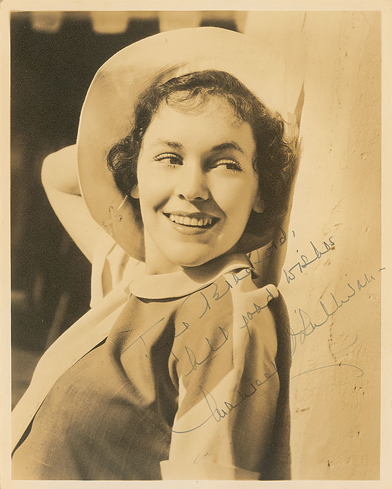 Vintage glossy 8 x 10 photo of O’Sullivan leaning against a wall, signed and inscribed in fountain pen “Joyce Bikeford, all good wishes, Maureen O’Sullivan.” In fine condition. Pre-certified PSA/DNA and RR Auction COA.