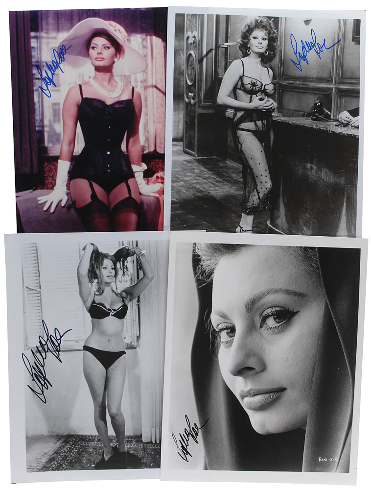 Four seductive glossy 8 x 10 photos of Loren, one color, each signed in blue or black felt tip. In overall fine condition, with a JSA label affixed to the reverse of each. Accompanied by certificates of authenticity from JSA for three photos. RR Auction COA.
