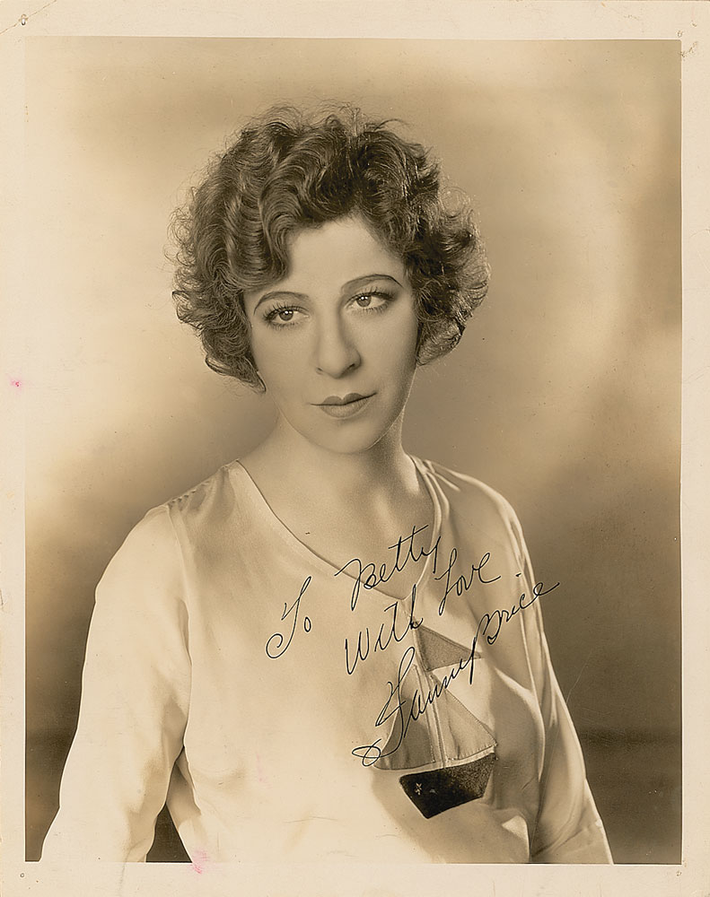 Vintage glossy 8 x 10 photo of Brice wearing a shirt with a sailboat design, signed and inscribed in fountain pen, “To Betty, With love, Fanny Brice.” In fine condition, with tack holes to corners and a small crease to the lower left (not affecting the strikingly dark signature). Pre-certified PSA/DNA and RR Auction COA.