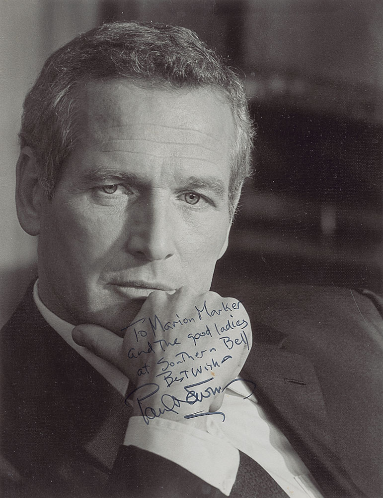 Semi-glossy 7.5 x 9.5 cardstock close-up photo of Newman deep in thought, signed and inscribed in black felt tip “To Marion Marker and the good ladies at Southern Bell, best wishes, Paul Newman.” In fine condition. Pre-certified PSA/DNA and RR Auction COA.