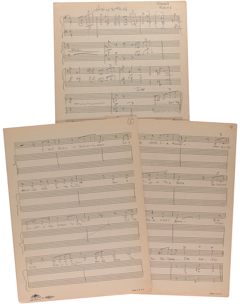 Academy Award–winning composer and producer (1905–1970) who played an integral role in MGM’s musical films during Hollywood’s ‘golden age.’ His credits include Easter Parade, Funny Face, and Meet Me in St. Louis. Handwritten musical manuscript in pencil for ‘Houston,’ six musically-lined pages both sides, 9.5 x 12.5, titled and signed at the top of the first page. Edens writes 96 bars of music and lyrics for ‘Houston,’ a likely unpublished song originally prepared for Judy Garland. In fine condition. RR Auction COA.