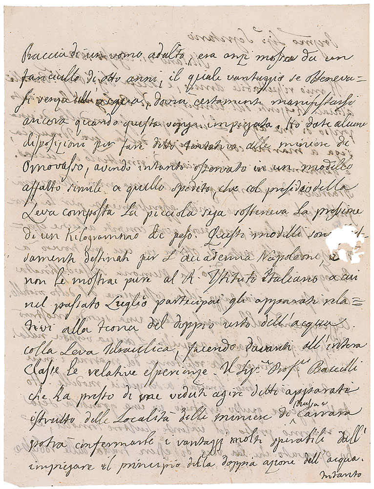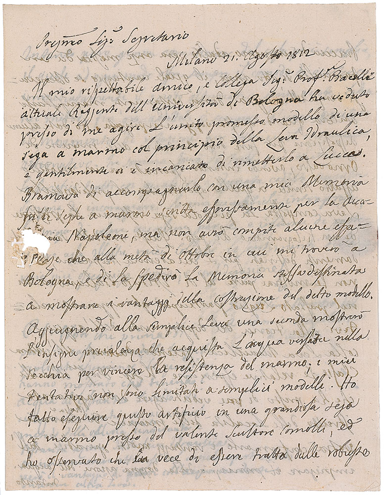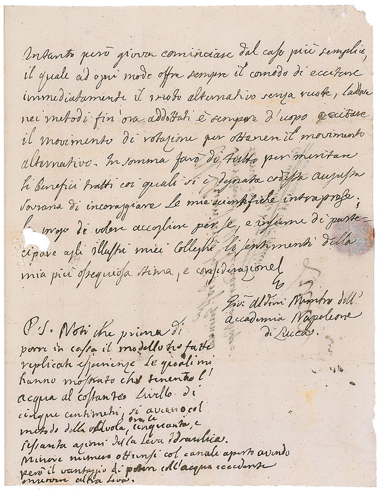 Italian physicist (1762–1834) and professor of physics at Bologna. ALS in Italian, signed “Gio. Aldini Ministro Academia Napoleone di Lucca,” three pages on two adjoining sheets, 7.25 x 9.5, August 21, 1812. Letter to Professor Grimaldi, Secretary of the Academy Napoleone. Aldini informs the professor that his personal “friend and colleague” Liberato Baccelli has decided to “send to Lucca” the “model of a marble saw on the principle of a hydraulic lever” invented by Aldini himself. Aldini also provides a small description of the mechanical principle of the lever. Reverse of second integral page bears an address panel and retains most of its red wax seal. Small hole to left edge of both pages, lightly affecting a few letters of text and some light show-through from writing on reverse, otherwise fine condition. RR Auction COA.