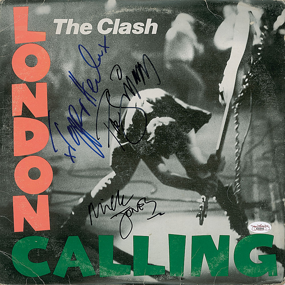 London Calling album signed on the front cover in blue and black felt tip by Mick Jones, Paul Simonon, and Topper Headon. Scattered creases, a light ‘ring of wear,’ and a JSA label affixed to the lower right corner, otherwise fine condition. Accompanied by a full letter of authenticity from JSA. A desirable example of their iconic album. Pre-certified Roger Epperson/REAL and RR Auction COA.