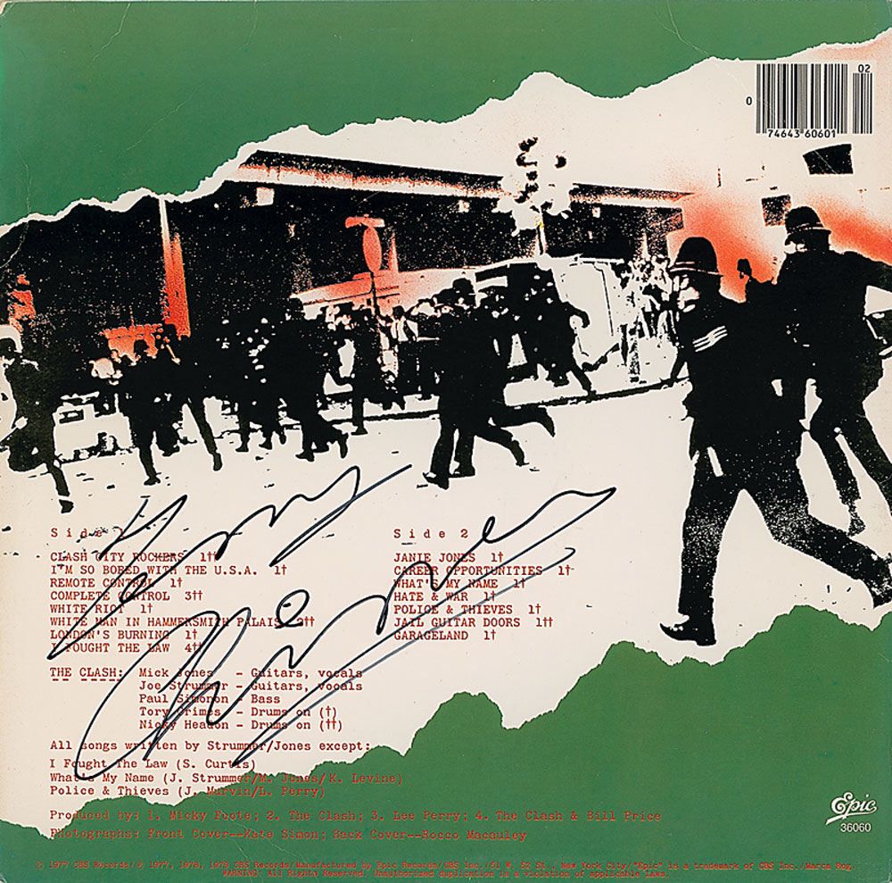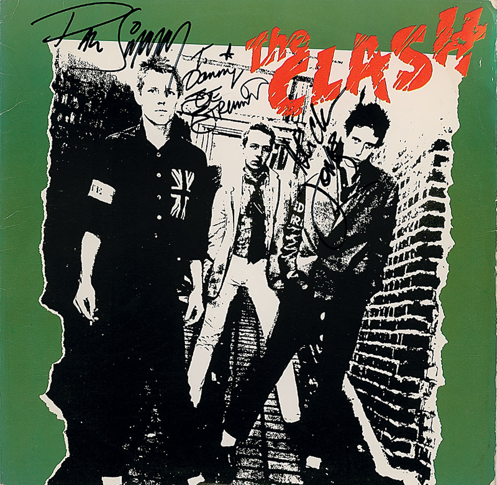 Self-titled debut album signed and inscribed on the front cover in black felt tip, “To Danny, Joe Strummer,” “Paul Simonon,” and “Mick Jones,” and on the back cover, “Terry Chimes.” In fine condition, with a few light creases. The record is included. Accompanied by a certificate of authenticity from Roger Epperson/REAL. Signatures were obtained in 1990s London by an acquaintance of the band who notes: “I befriended the members of BAD II, they used to invite to their gigs. I was living in London in the 90's. I met Joe when he played in Barcelona. I was the only one in the whole venue who appeared with all the Clash LPs. He invited me to the show, and after his gig we went together to see La Fundación Tony Manero (a local funk band) at the Bikini venue.mI met Paul at the KGB venue in Barcelona. I interviewed him for Popular 1 (one of the most important Spanish music mags) when he came with Havana 3AM. He invited me to the backstage after the show.” RR Auction COA.