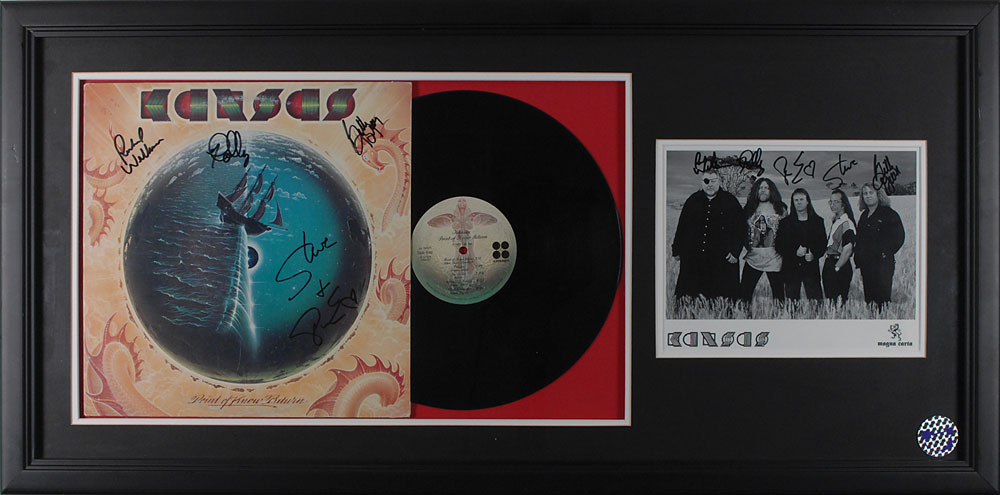 Two items: Point of No Return album, signed on the front cover in black felt tip by Steve Walsh, Rich Williams, Robby Steinhardt, and Billy Greer; and a 10 x 8 promotional photo, signed in black felt tip by Steve Walsh, Billy Greer, Rich Williams, Phil Ehart, and Robby Steinhardt. Double-matted and framed together to an overall size of 37.5 x 18.5. In fine condition. Oversized. Pre-certified Roger Epperson/REAL and RR Auction COA.