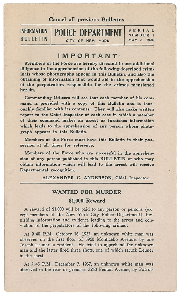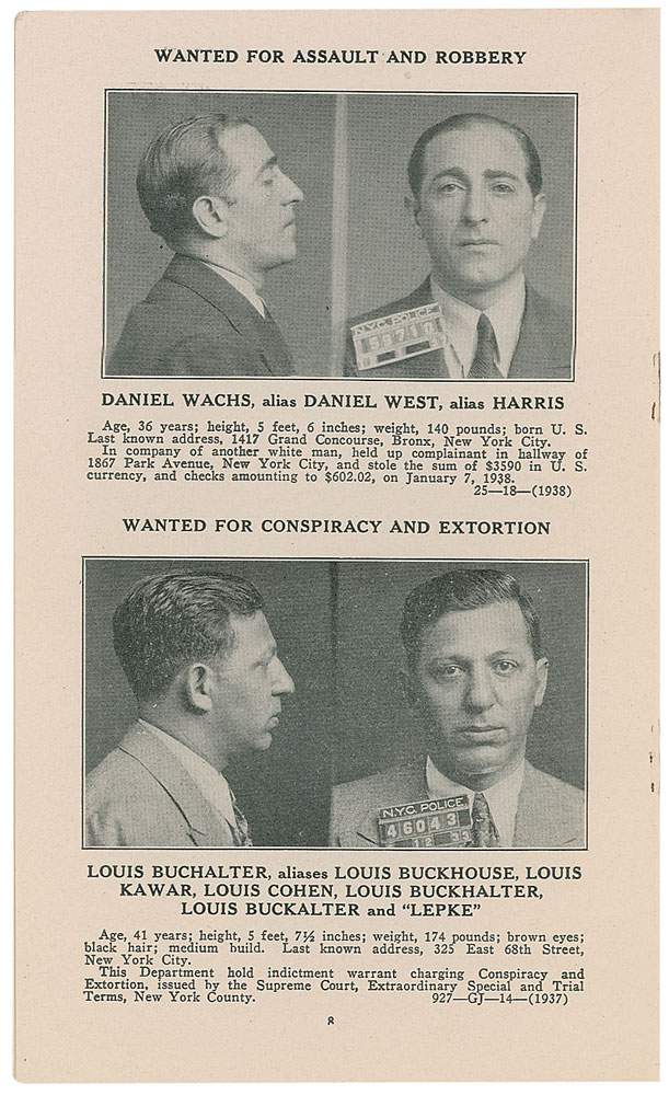NYPD police information bulletin, dated May 6, 1938, 4.5 x 7.5, 14 pages, featuring mug shots and descriptions of wanted criminals from throughout the city. One perpetrator featured is Louis Buchalter of Murder, Inc., who is “Wanted for Conspiracy and Extortion.” Indictments for others include murder, forgery, and grand larceny. In fine condition. Provenance: Eugene Canevari Collection. RR Auction COA.