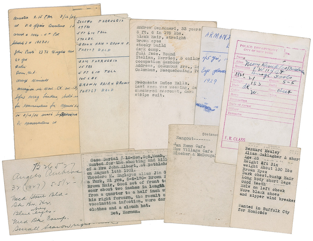 Collection of approximately 28 original mug shot-style photos, ranging in size from 1.5 x 2.5 to 7.5 x 3.75, featuring various wanted criminals, most with names and information inherent to the photo. Some crimes include “Triple Murder,” “Drug Store Robberies,” and “Con Man.” In overall fine condition, with expected general wear. Provenance: Eugene Canevari Collection. RR Auction COA.