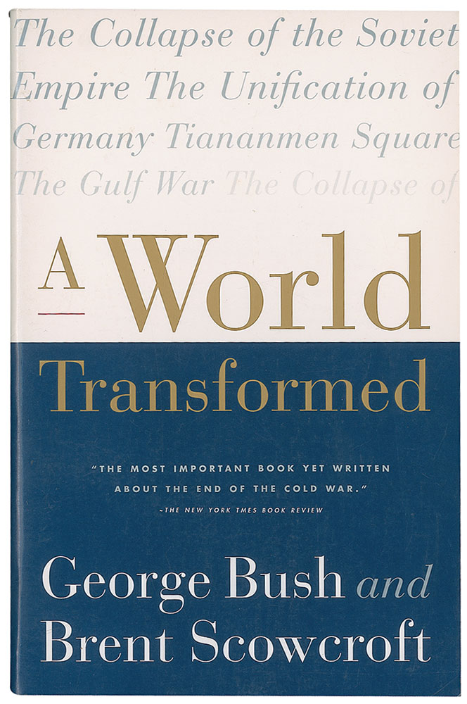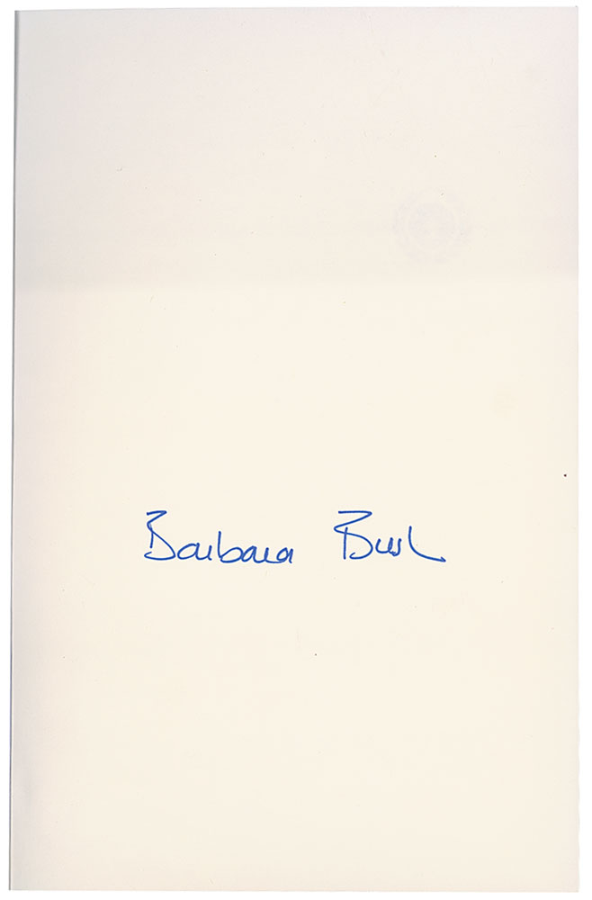Two books: a softcover edition of A World Transformed signed and inscribed in blue felt tip on an opening page, “To a YMCA supporter, George Bush”; and a hardcover edition of Barbara Bush: A Memoir, signed on the second free end page in blue ink by Barbara Bush. In fine condition. RR Auction COA.