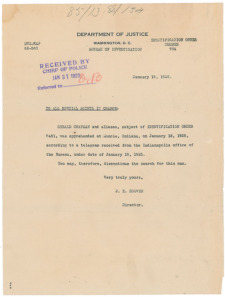 Criminal (1887–1926) who co-led an early Prohibition-era gang with George ‘Dutch’ Anderson. He was known as ‘The Gentleman Bandit,’ and was the first to be called ‘Public Enemy Number One’ by the press. Two typed Department of Justice documents related to Chapman. First includes the information for producing a wanted poster and labels him as a “Fugitive from Justice,” one page, 8 x 10.25, August 16, 1923, and includes a physical description and details of two of his escapes from custody; stapled to the document is a mug shot showing Chapman with and without his glasses. Second was issued by J. Edgar Hoover, one page, 8 x 10.5, January 19, 1925, reporting that Chapman “was apprehended at Muncie, Indiana…therefore, discontinue the search for this man.” Expected document wear, otherwise overall fine condition. RR Auction COA.