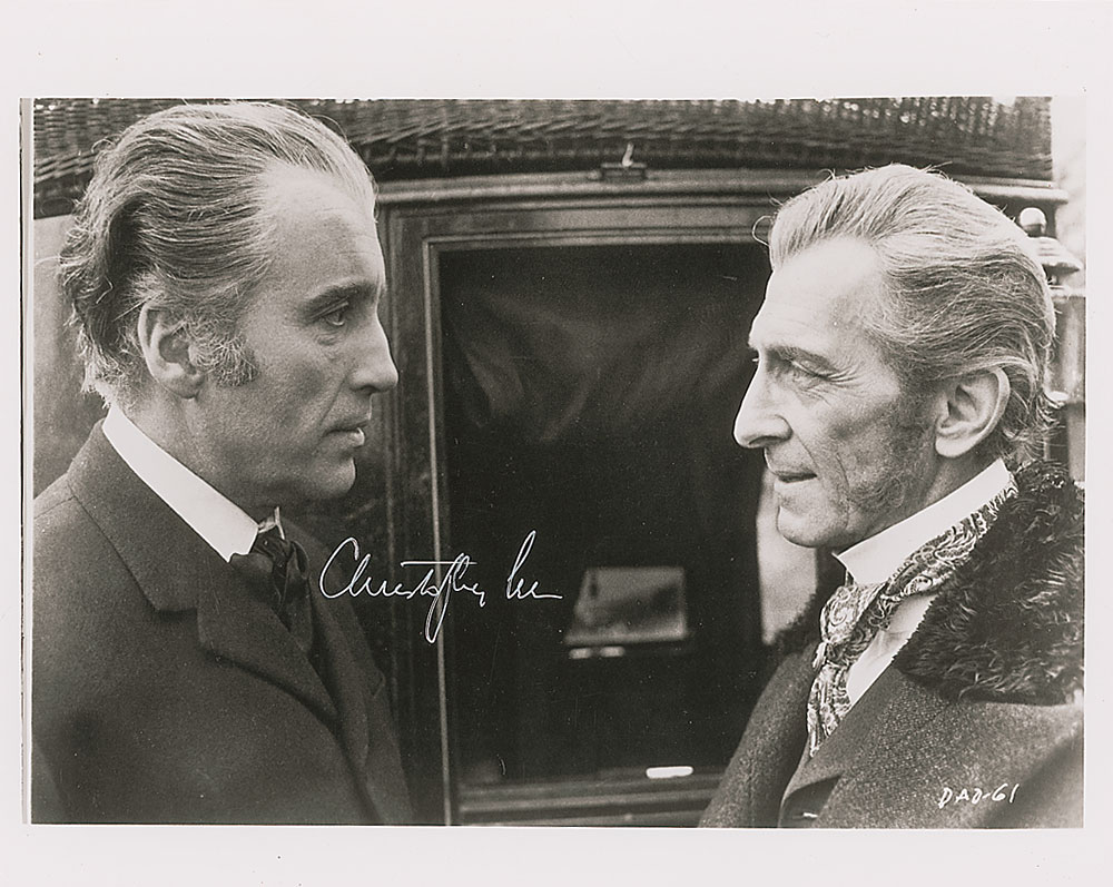 Glossy 10 x 8 photo of Lee and Peter Cushing in Dracula AD 1972, signed in silver ink by Lee. In very fine condition. Pre-certified PSA/DNA and RR Auction COA.